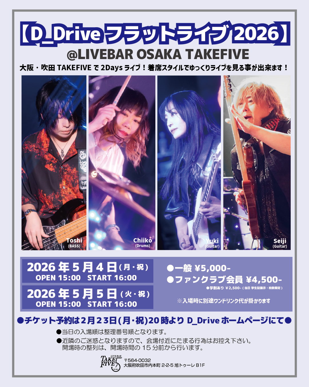 一般¥5,500- ファンクラブ会員様¥5,000- 学割あり(詳しくは下記を参照して下さい) 【+1 ドリンク別途】